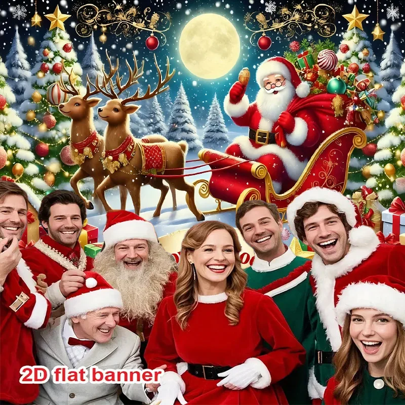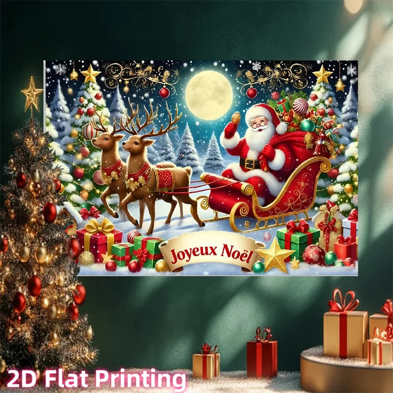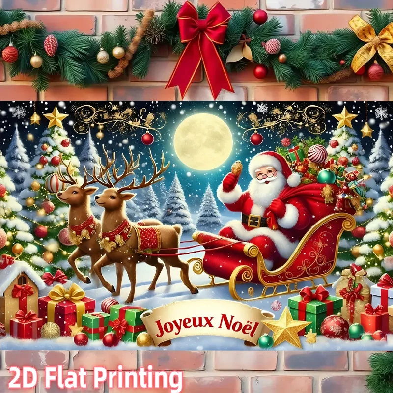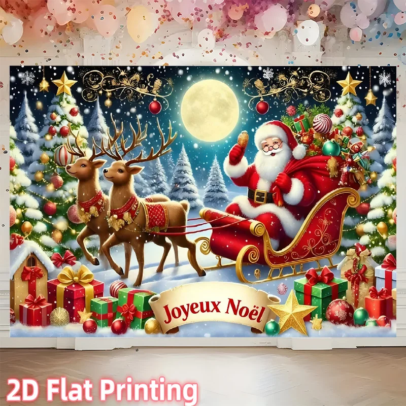Bannière de Noël française affichant Joyeux Noël avec Père Noël en traîneau et rennes.