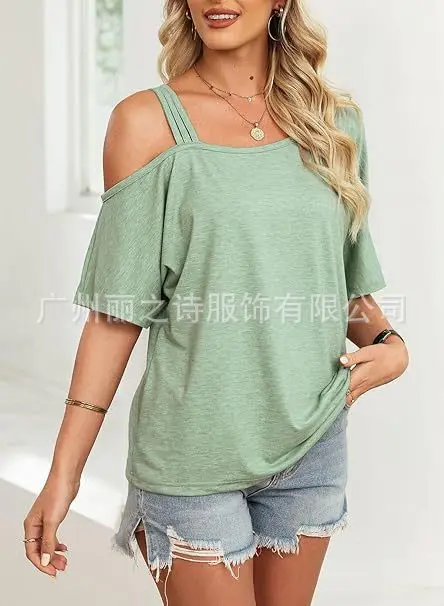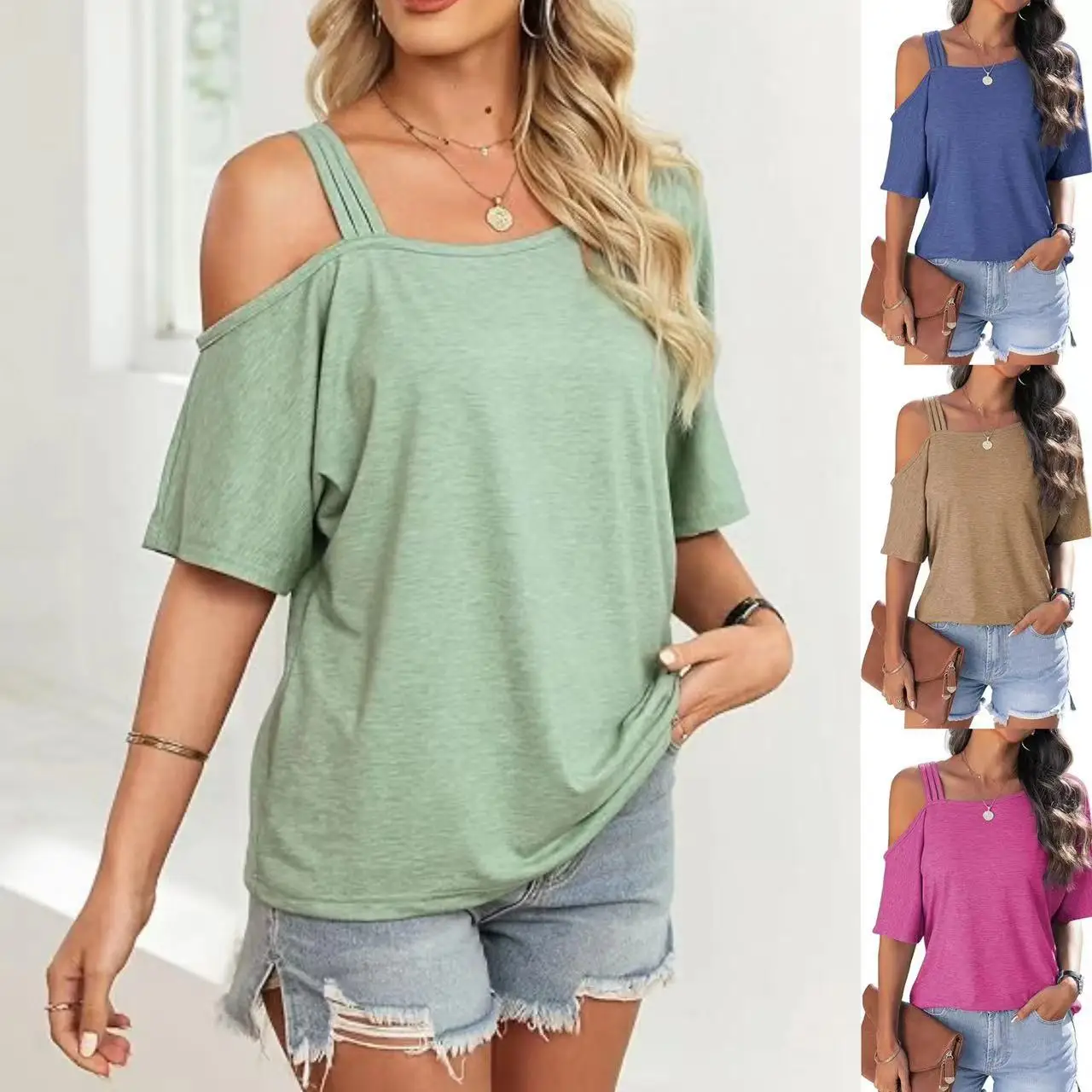 2025 Women's T-shirt Trendy Summer Solid Color New Casual Slant Neck Off-shoulder Wear Loose Short-sleeved Femme Streetwear Tee