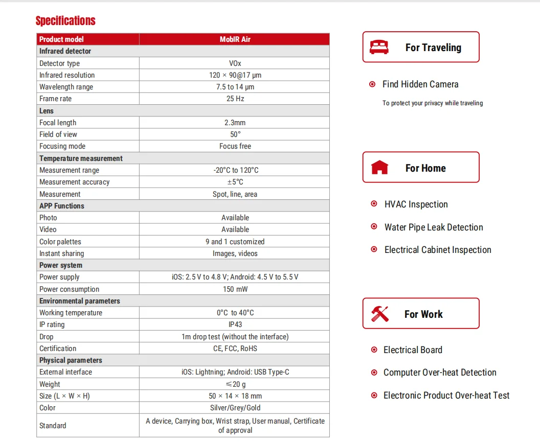 MobIR Air transforms the smartphone into a thermal camera. When connect it to a smartphone, the MobIR Air allows you to see theworld which is invisible with your eyes. It can find and fix the HVAC issues quickly and accurately, detect building problems effectively and safely, test the electrical faults and it can be also used for patrol at night.